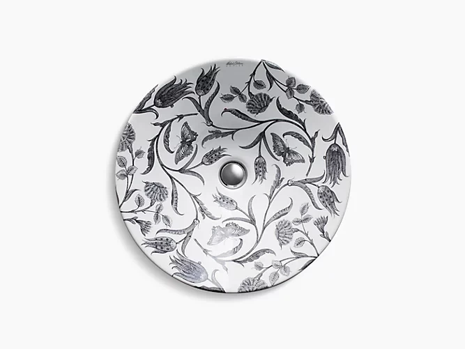 Inspired by a 16th-century Turkish design, Botanical Study features intricate line work of tulips and chrysanthemums winding together. The floral pattern paired with the Conical Bell vessel sink creates the striking traditional look of a washbasin. The neutral palette blends beautifully with natural materials and muted tones.