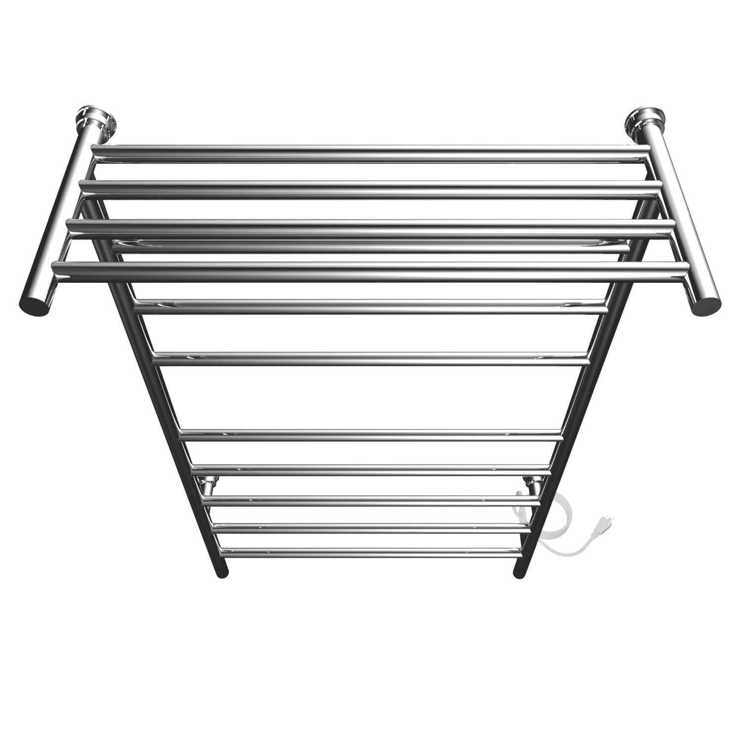 The wall-mounted Angle towel warmer by Kontour combines a convenient towel warmer shelf plus heated towel bars. Fold and stack towels on top to store and warm them or hang them below to dry.