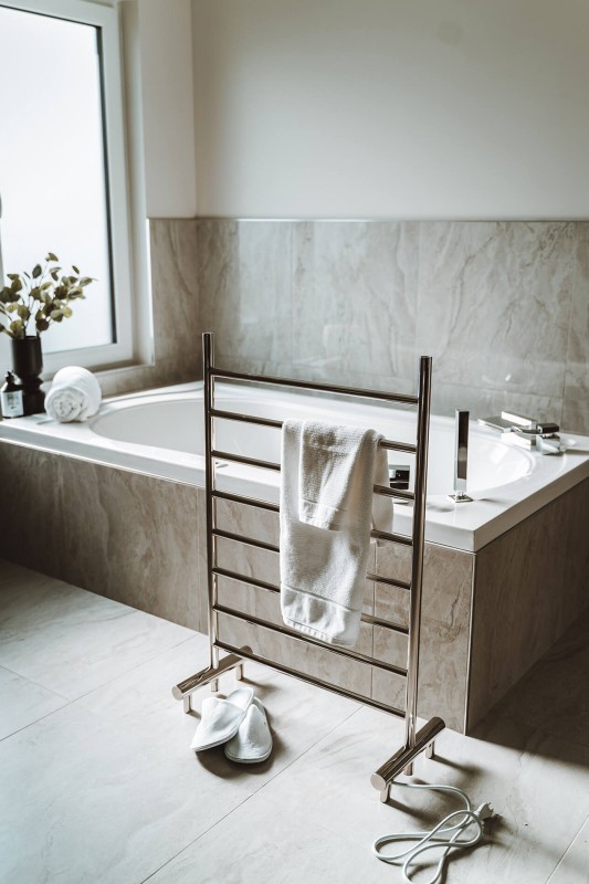 Venture into the wonderful world of towel warmers with the clean and contemporary look of Camber by Kontour. Lightweight, free standing and mobile, Camber conveniently plugs into the wall in any room in your home that could use a little extra coziness.