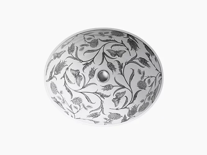 Inspired by a 16th-century Turkish design, Botanical Study features intricate line work of tulips and chrysanthemums winding together. The floral pattern paired with the oval Caxton sink creates a casual, traditional feel. In a neutral palette that blends beautifully with natural materials and muted tones, this under-mount sink adds an alluring touch to your bath or powder room.