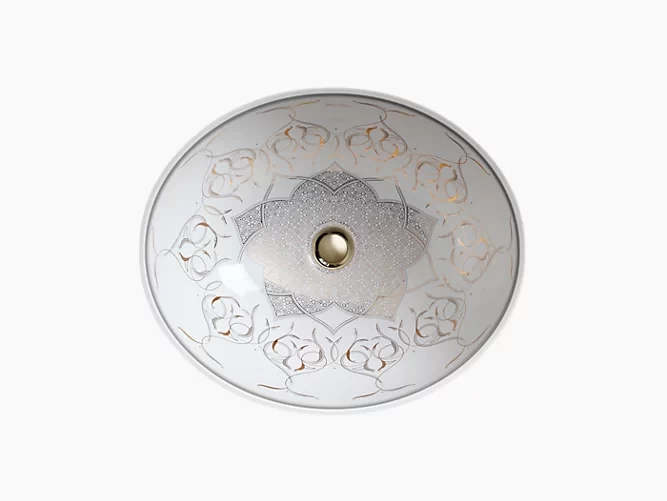 Decorative architecture and Moorish style define the distinctive Persia pattern. Striking open linework contrasts with geometric patterns, giving this Caxton sink its finely detailed look. A white background emphasizes the pattern yet is neutral enough to complement different fixture styles. This sink makes a dramatic, artistic statement.