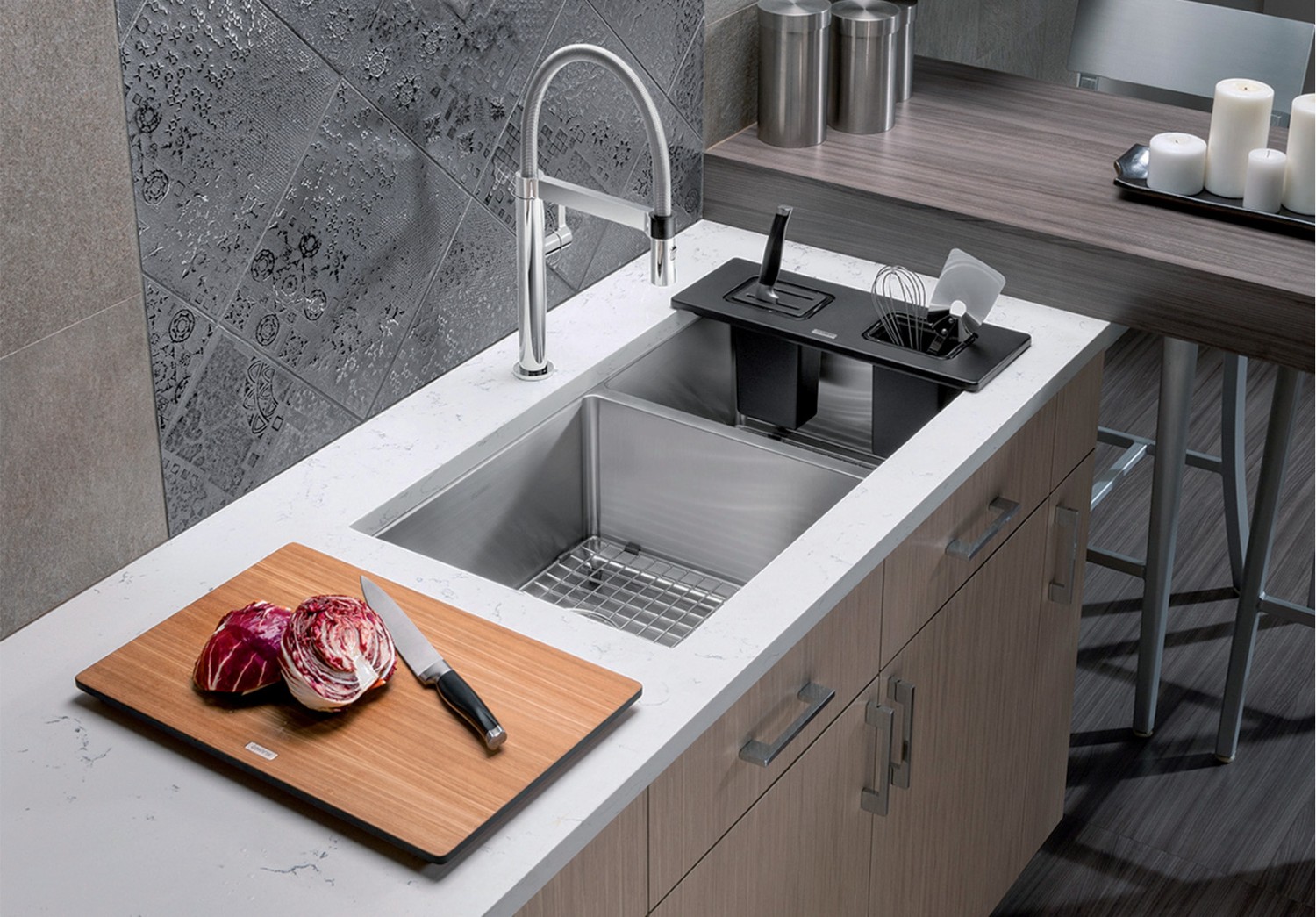 Rear-positioned drain location for maximum usable bowl and cabinet storage