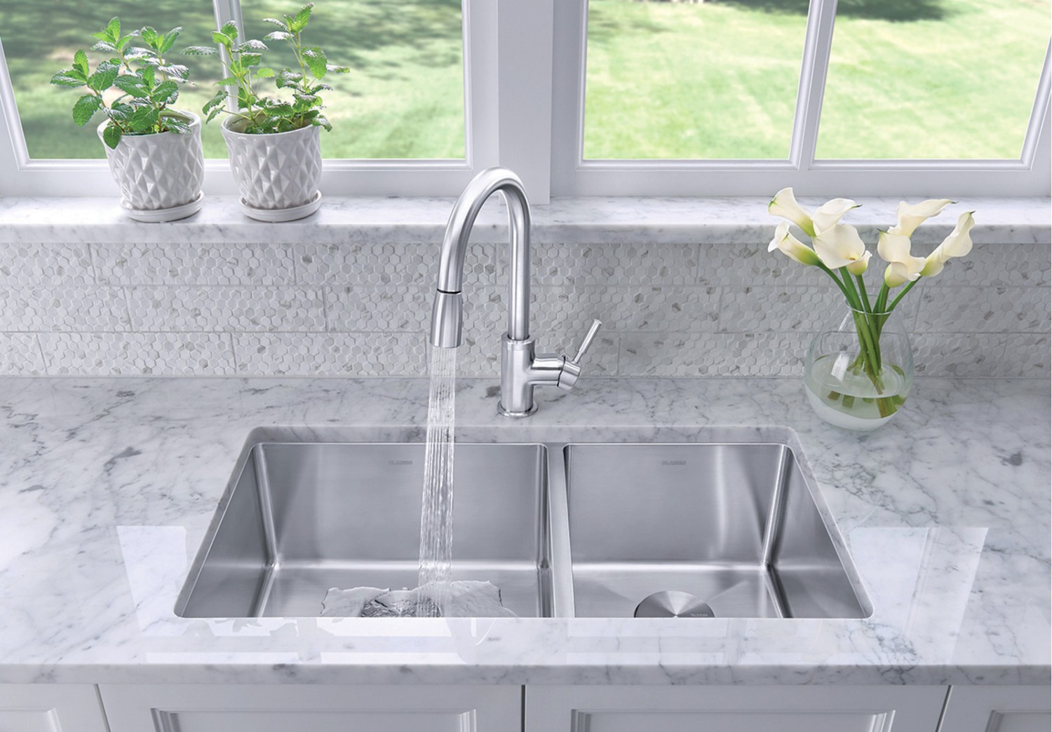 X-pattern drain grooves quickly remove water from the sink