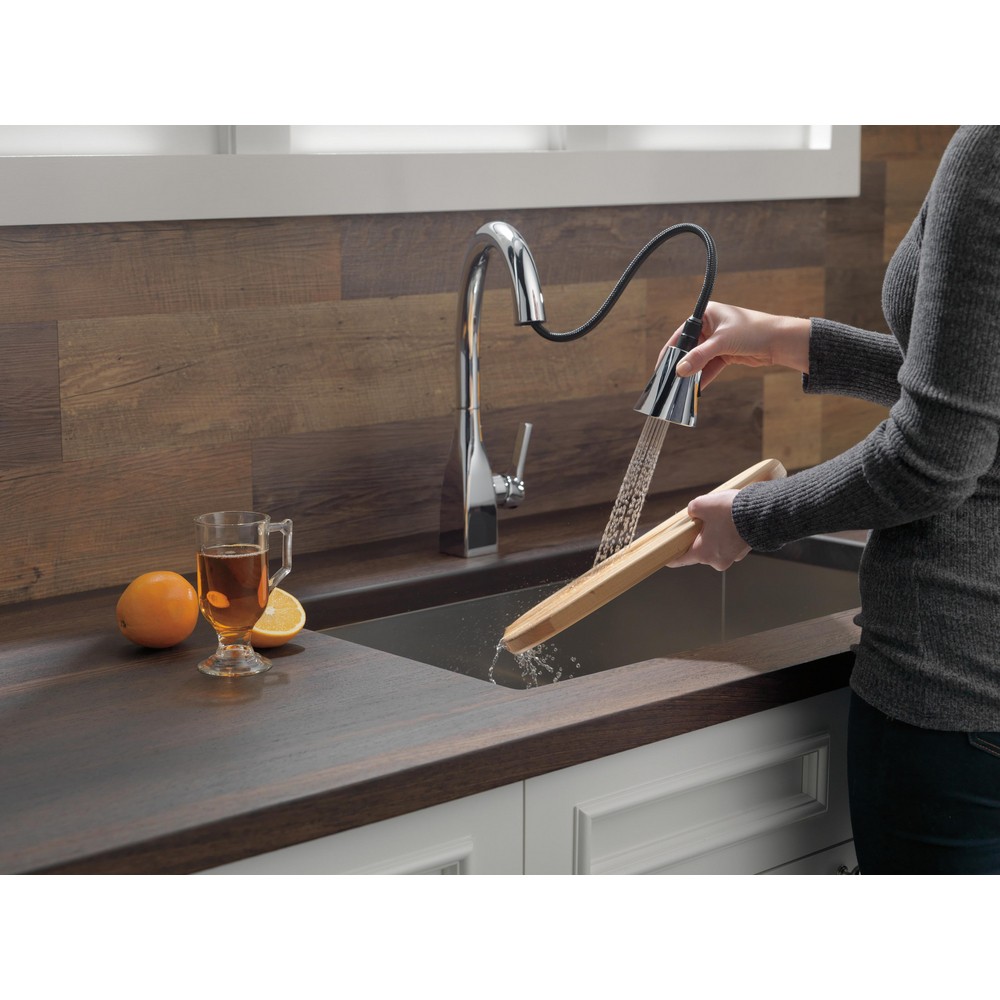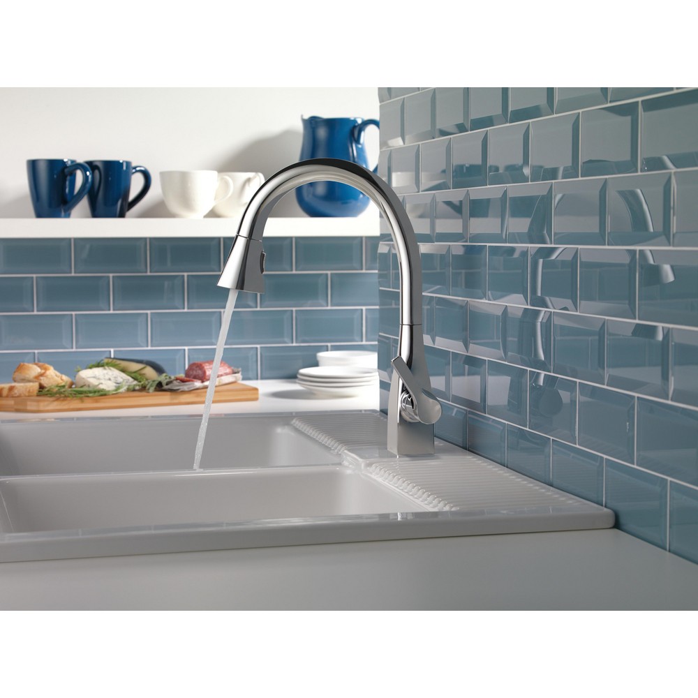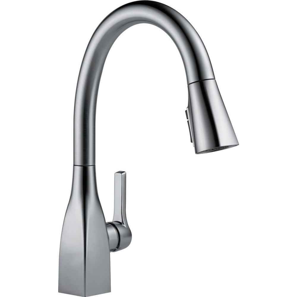 Delta MagnaTite Docking uses a powerful integrated magnet to pull your faucet spray wand precisely into place and hold it there so it stays docked when not in use. Delta ShieldSpray Technology cleans with laser-like precision while containing mess and splatter. A concentrated jet powers away stubborn messes while an innovative shield of water contains splatter and clears off the mess, so you can spend less time soaking, scrubbing and shirt swapping. Delta faucets with DIAMOND Seal Technology perform like new for life with a patented design which reduces leak points, is less hassle to install and lasts twice as long as the industry standard*. Kitchen faucets with Touch-Clean Spray Holes allow you to easily wipe away calcium and lime build-up with the touch of a finger. You can install with confidence, knowing that Delta faucets are backed by our Lifetime Limited Warranty. *Industry standard is based on ASME A112.18.1 of 500,000 cycles.